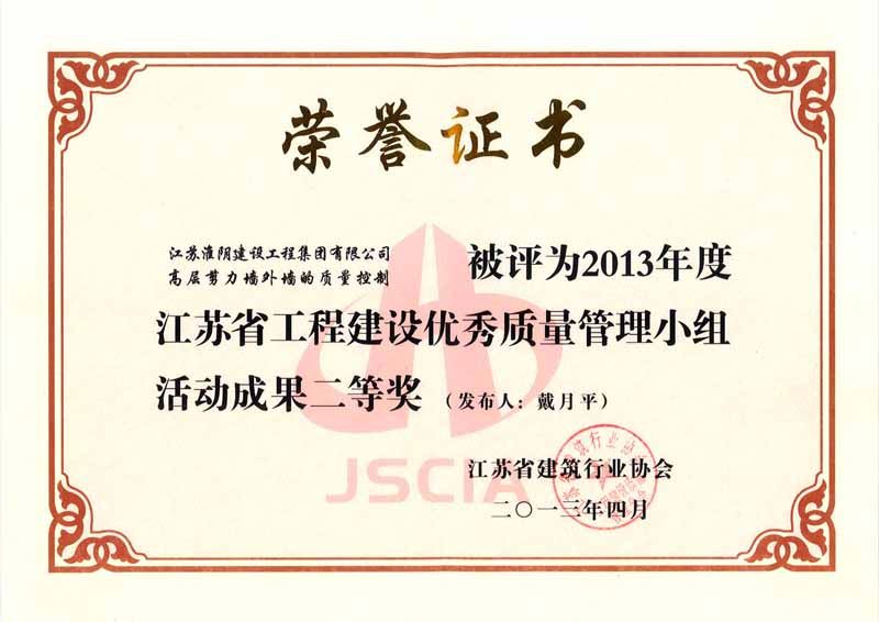 2013年度江苏省工程建设优秀质量管理小组活动成果二等奖