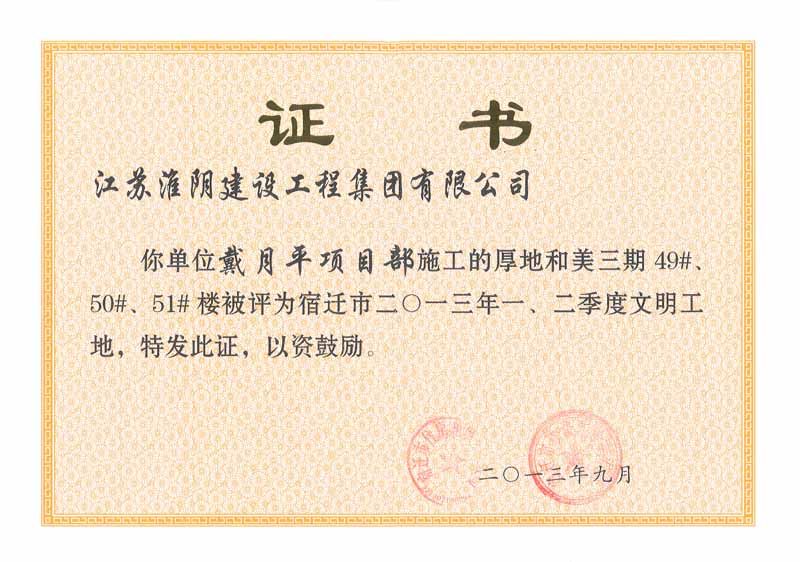 2013年度江苏省建筑施工文明工地-厚地和美-戴月平