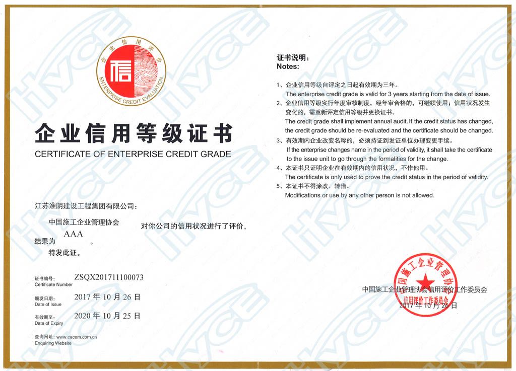 企业信用等级证书AAA-中国施工企业管理协会