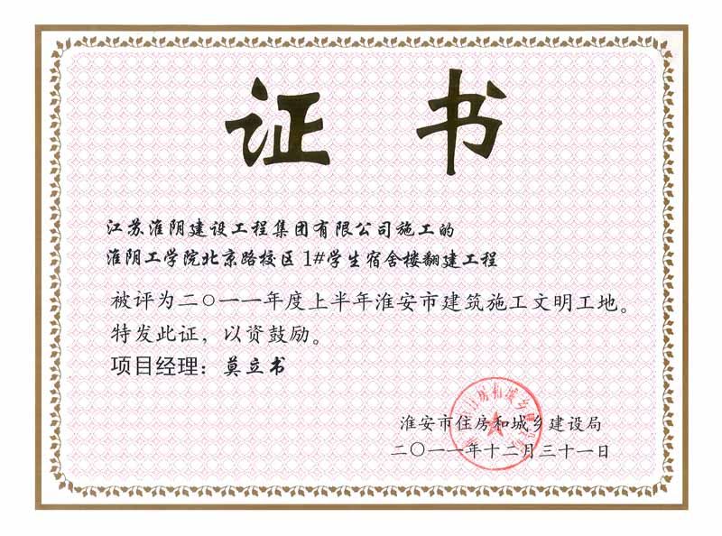 2011年文明工地淮阴工学院北京路小区1#学生宿舍楼接翻建工程