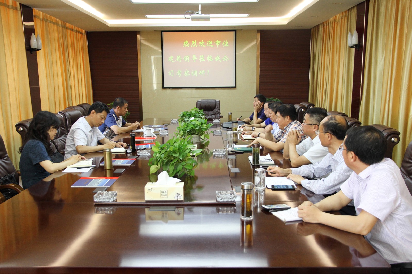 6月18日上午,市住建局秦华明调研员携建筑业发展处负责人一行4人莅临我公司调研。集团胡从亮董事长首先对秦华明调研员刚调任到住建局即赴挂钩企业淮建进行调研表示热烈欢迎和由衷感谢,并就企业资产、资质状况、人力资源、组织机构、股权结构、生产经营及存在困难和问题等七个方面进行了简要汇报。